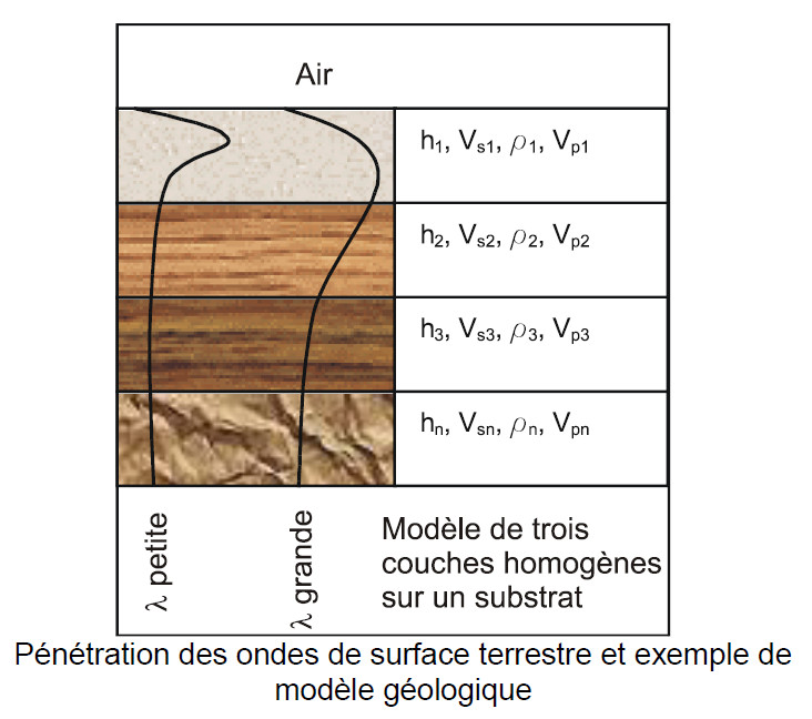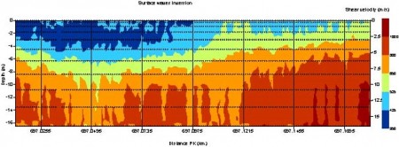 Our QC software of processing data on line calculates the curves of dispersion for each shot. These curves describe the properties of propagation of the surface wave. They are used to compute the shear wave velocity until 50 m of depth. As shear wave velocity is directly proportional to the modulus of rigidity, this gives us an immediate indication on the profile of the stiffness or rigidity of the grounds without having to carry out drilling, cross-hole or another expensive technique. This technique is non invasive.